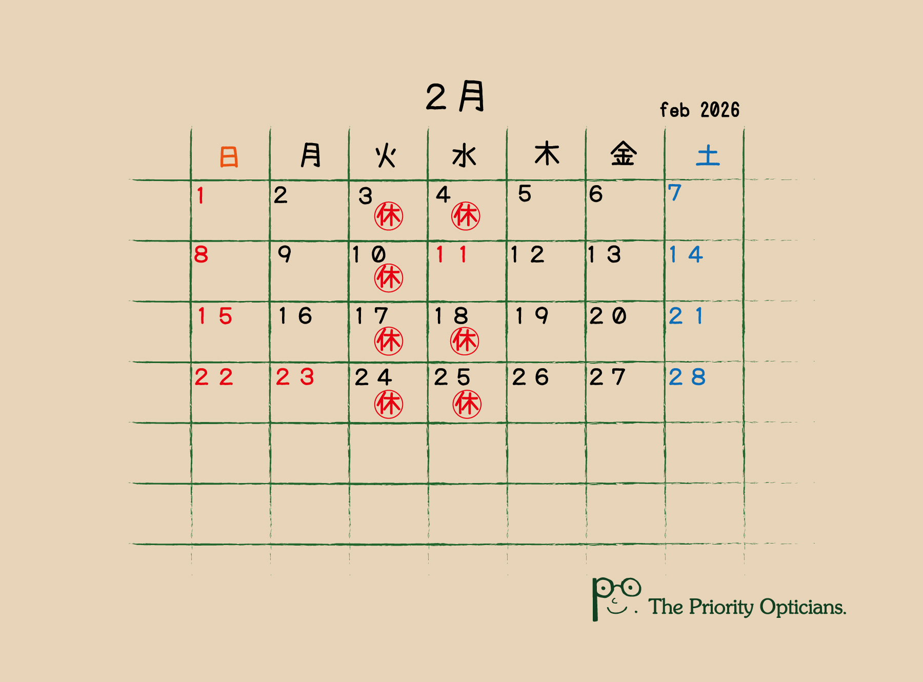 2026.01.30 2月の営業日のご案内 2月の営業日のご案内です。 当店はご予約制となっております。 →ご予約はこちら 公式ラインもございます。 @pri-opt 電話:0258-94-5454 営業時間:10:00〜19:00(ご予約あれば20:00まで) ご予約する Post Share Hatena Pocket Pin it 1月の営業日のご案内 ※臨時休業有...